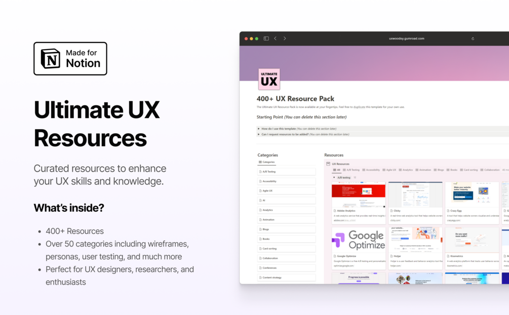 Why is it useful, you ask? Well, imagine having instant access to a plethora of industry-leading tools, insightful articles, inspiring case studies, captivating videos, and handy templates—all specifically tailored to elevate your UX skills to new heights. Whether you're a UX designer, developer, or researcher this pack has something for everyone, providing practical guidance and expert advice to enhance every aspect of your UX workflow.