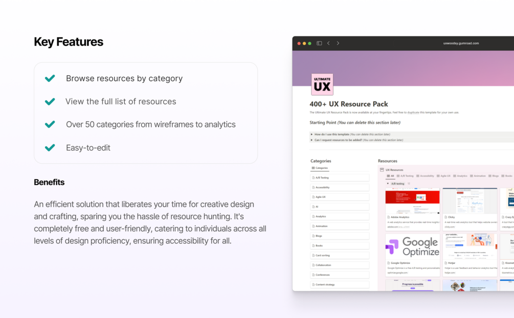 - Access to over 400 high-quality UX resources and tools, including fonts, design systems, icons, personas and so much more.